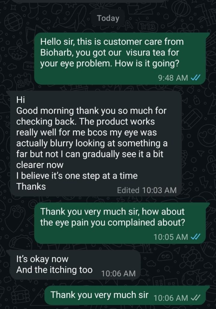 “I couldn’t read my Bible because my eyes were always blurry. After using Visura Herbal Tea for two weeks, I can read small letters clearly again. Thank you!”