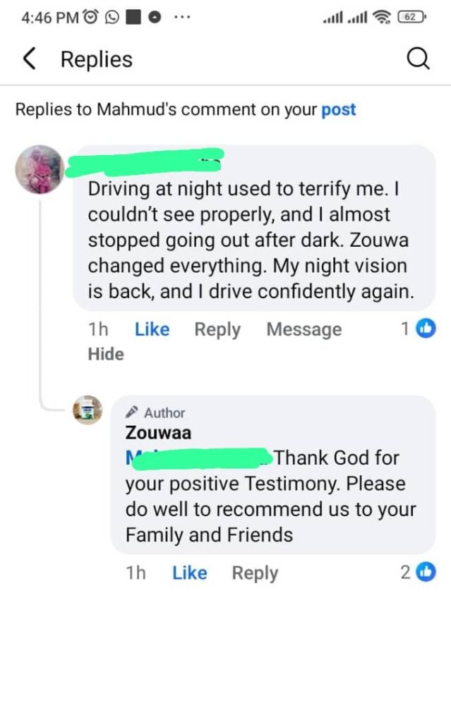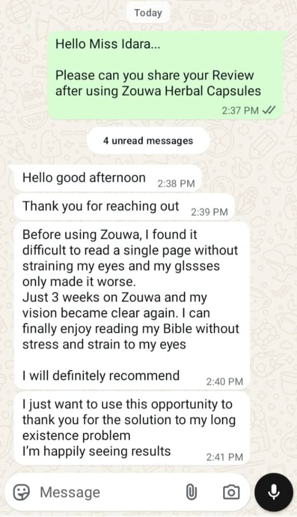 She told me about Zouwa Herbal Capsules, a natural remedy she heard about from a friend. At first, I doubted it… after all, nothing had worked before. But Amaka begged me to try, saying, “Chinyere, don’t let your eyes steal your happiness.”